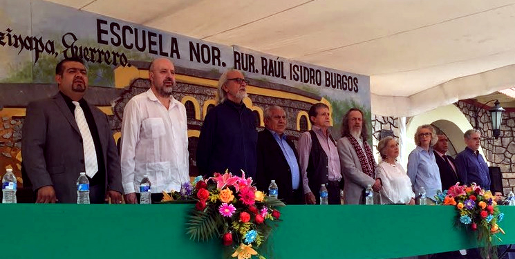 padrinos-de-ayotzinapaA esa promoción pertenecen los 43 estudiantes desaparecidos desde el 26 de septiembre de 2014. En compañía de Héctor Bonilla, Rafael Barajas El Fisgón, Marta Lamas, Elena Poniatowska, Armando Bartra, Gabriel Retes y Luis Hernández Navarro, fui padrino de la generación incompleta que se graduó el 18 de julio, bajo el lema de “Sangre, resistencia y esperanza”.