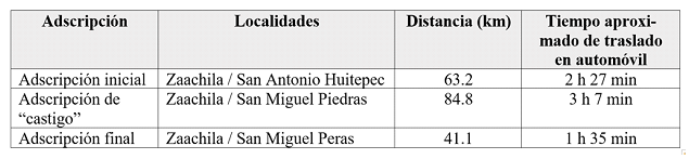 En la siguiente tabla se indican los desplazamientos que hubiera hecho el profesor desde su lugar de residencia (Zaachila) hasta la escuela que le fuera impuesta o asignada.