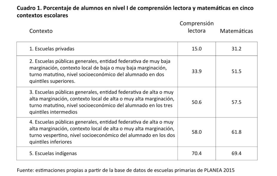 Una fracción significativa de esta heterogeneidad se explica por las diferencias en el entorno social en el que se encuentran las escuelas. La variabilidad en los contextos geográficos y sociales, en los entornos institucionales, y en la composición geográfica del alumnado, son todas características que imponen distintos grados de reto para la enseñanza y el aprendizaje. Como ya lo han señalado otros analistas, entre ellos Manuel Gil y el consejero del INEE Eduardo Backhoff, los resultados de PLANEA no se pueden comprender fuera del contexto de la enorme desigualdad social que priva en el país.