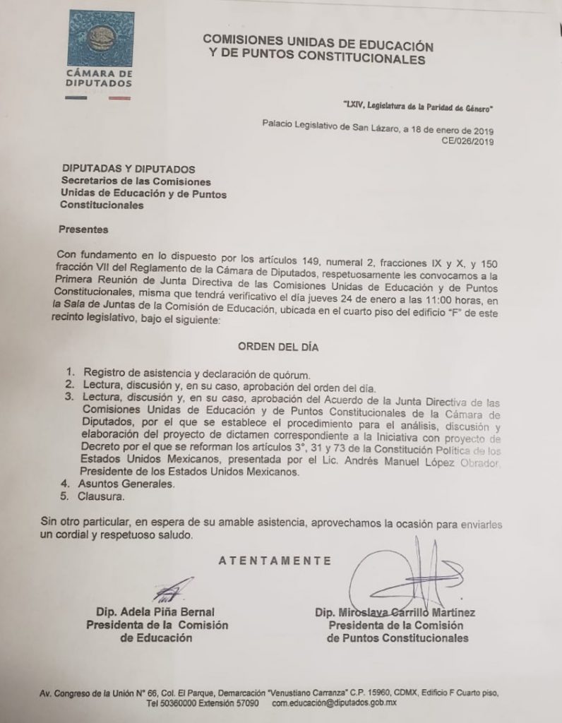 Educación Futura tuvo acceso a la convocatoria para acudir a la primera reunión de la Junta Directiva de ambas comisiones, emitida el viernes pasado, para el análisis, discusión y elaboración del proyecto de dictamen sobre la Iniciativa con proyecto de Decreto para reformar los artículos 3°, 31 y 73 de la Constitución, presentada por el Presidente Andrés Manuel López Obrador.