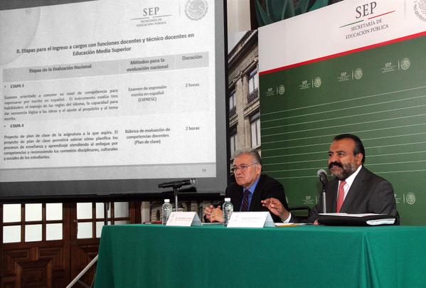 Para el ingreso a cargos con funciones docentes y técnicos docentes en la educación media superior la evaluación se realiza en cuatro etapas: un examen de conocimientos –mide dominio de contenidos disciplinares–, examen de conocimientos orientado a las habilidades docentes –que faciliten las experiencias de aprendizaje significativo para los estudiantes–, examen de español –medirá manejo de las reglas del idioma, la capacidad para dar secuencia lógica a las ideas y el ajuste al propósito y al tema escrito, y el proyecto de plan de clases de la asignatura a la que se aspira –para valorar como se planifican los procesos de enseñanza y aprendizaje, atendiendo al enfoque por competencias–.