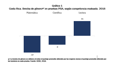 El Noveno Informe Estado de la Educación de Costa Rica (PEN, 2023), realizó un abordaje especial al tema de brechas de género en la educación, con énfasis en la formación docente. Con datos administrativos del Ministerio de Educación Pública y los resultados de pruebas estandarizadas de la UNESCO y OCDE se encontró que las brechas inician a edades tempranas, afectan de distinta forma a hombres y mujeres y se consolidan hacia la educación secundaria. Costa Rica tienen de las brechas más amplias entre hombres y mujeres. Por ejemplo, los datos de PISA revelan que las mujeres obtienen puntajes mucho menores que sus pares masculinos en las pruebas de Ciencias y Matemática (Gráfico 1).