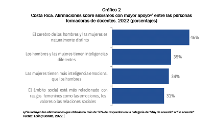 ⦁ Las personas formadoras de docentes reportan poco dominio de temas relacionados con género en la educación. Mediante una encuesta aplicada a docentes universitarios de carreras de educación sobre sus concepciones en temas de género y el desarrollo de habilidades en los estudiantes, León y Beirute (2022) encontraron persistencia de sexismos o mitos relacionados con el aprendizaje de hombres y mujeres, por ejemplo, se sigue pensando que los cerebros y los tipos de inteligencia difieren según el sexo (gráfico 2). Estas afirmaciones, no cuentan con sustento científico y más bien obedecen a estereotipos de género construidos y difundidos socialmente.
