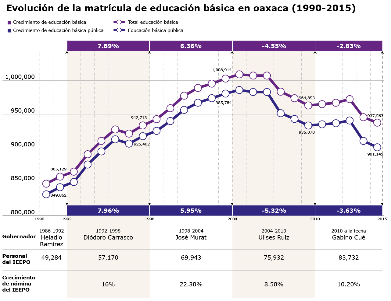 Por eso no sorprende que el crecimiento de la nómina magisterial en Oaxaca haya sido a tasas muy superiores a las observadas en la matrícula de educación básica pública en la entidad. Por ejemplo, con Diódoro Carrasco la nómina creció 16 por ciento pero la matrícula de educación básica pública sólo creció 7.9 por ciento. En su sexenio, Murat cedió 12,773 plazas a la sección 22 pese que la matrícula sólo creció 5.9 por ciento. Peor aún, tanto en la administración de Ulises Ruiz como en la del actual gobernador Cué, la matrícula ha caído pero eso no ha importado porque sendos mandatarios nuevamente le cedieron más plazas al liderazgo magisterial oaxaqueño.