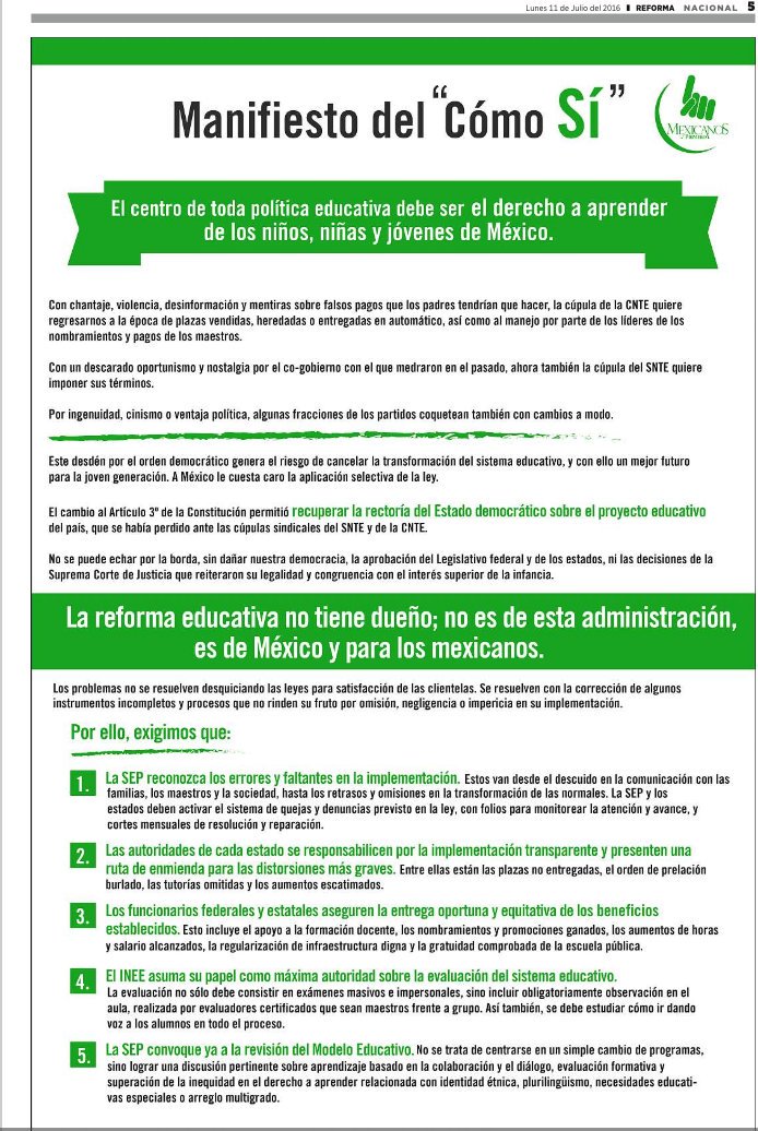 Mientras que denunció el “descarado oportunismo” del SNTE, así como su “nostalgia por el co-gobierno con el que medraron en el pasado”. Mexicanos Primero criticó que fracciones de partidos políticos coqueteen con cambios a modo “por ingenuidad, cinismo o ventaja política”.