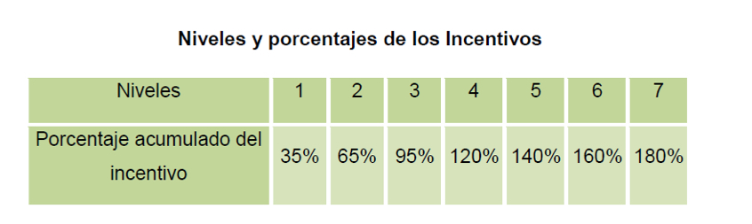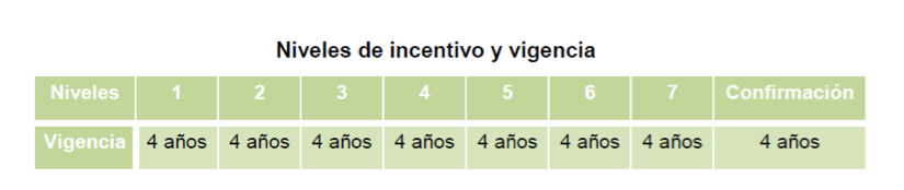 El calendario del programa de incentivos se empalma con el de la evaluación docente. Y se distribuyen los beneficios del programa en 7 niveles, distribuidos cada 4 años de servicio, y por cada nivel hay un incremento porcentual.