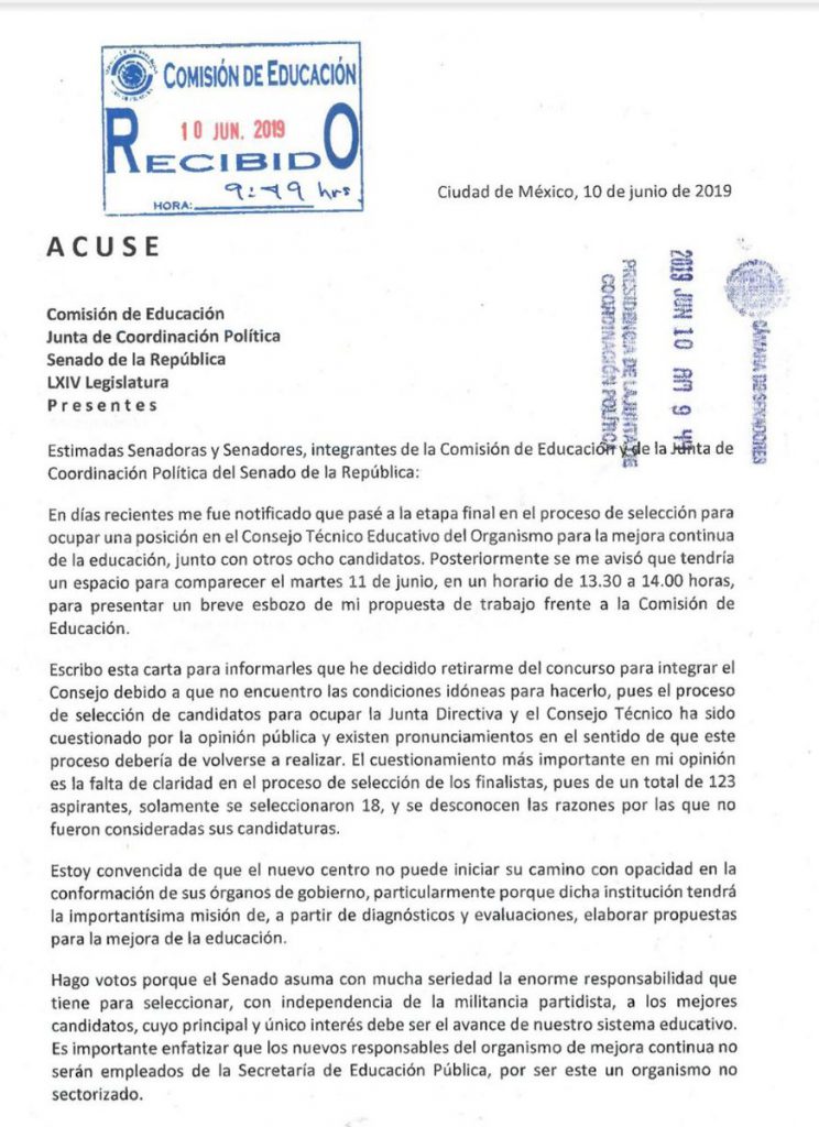 Arcelia Martínez Bordón, investigadora del INIDE de la Universidad Iberoamericana y aspirante a formar parte del Consejo Técnico del nuevo Organismo Educativo, ha renunciado al concurso para integrar dicho Consejo.