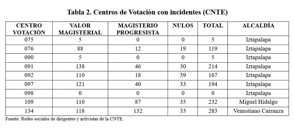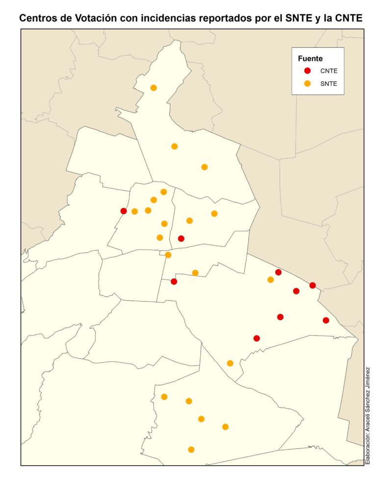 De los 141 Centros de Votación sólo 20 se reportaron con incidentes, según el CNE. Aunque se tiene información confirmada de que en al menos 9 centros más hubo roces y enfrentamientos con los maestros que trataron de impedir su apertura; la información fue recabada de las cuentas en redes sociales de dirigentes y activistas de la CNTE.