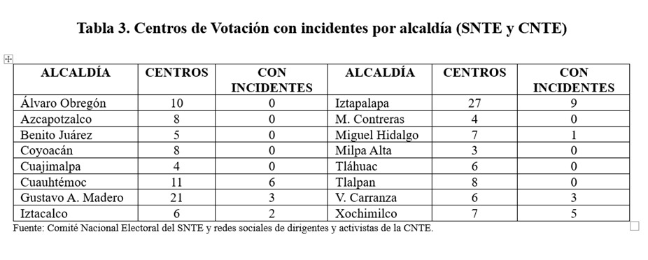 Sumando los reportes de la CNE del SNTE y de la CNTE, Iztapalapa es la demarcación que tuvo en números absolutos más Centros de Votación con incidentes (9).