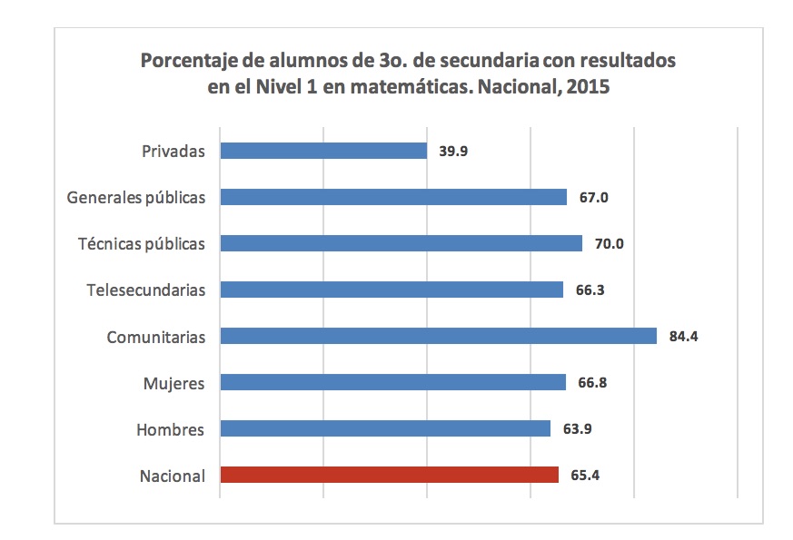 En el Nivel I de desempeño, relativo al uso más elemental de la información, se ubican más de la mitad de los alumnos de las escuelas Generales públicas, siete de 10 de las Comunitarias y ocho de 10 de la Indígenas.